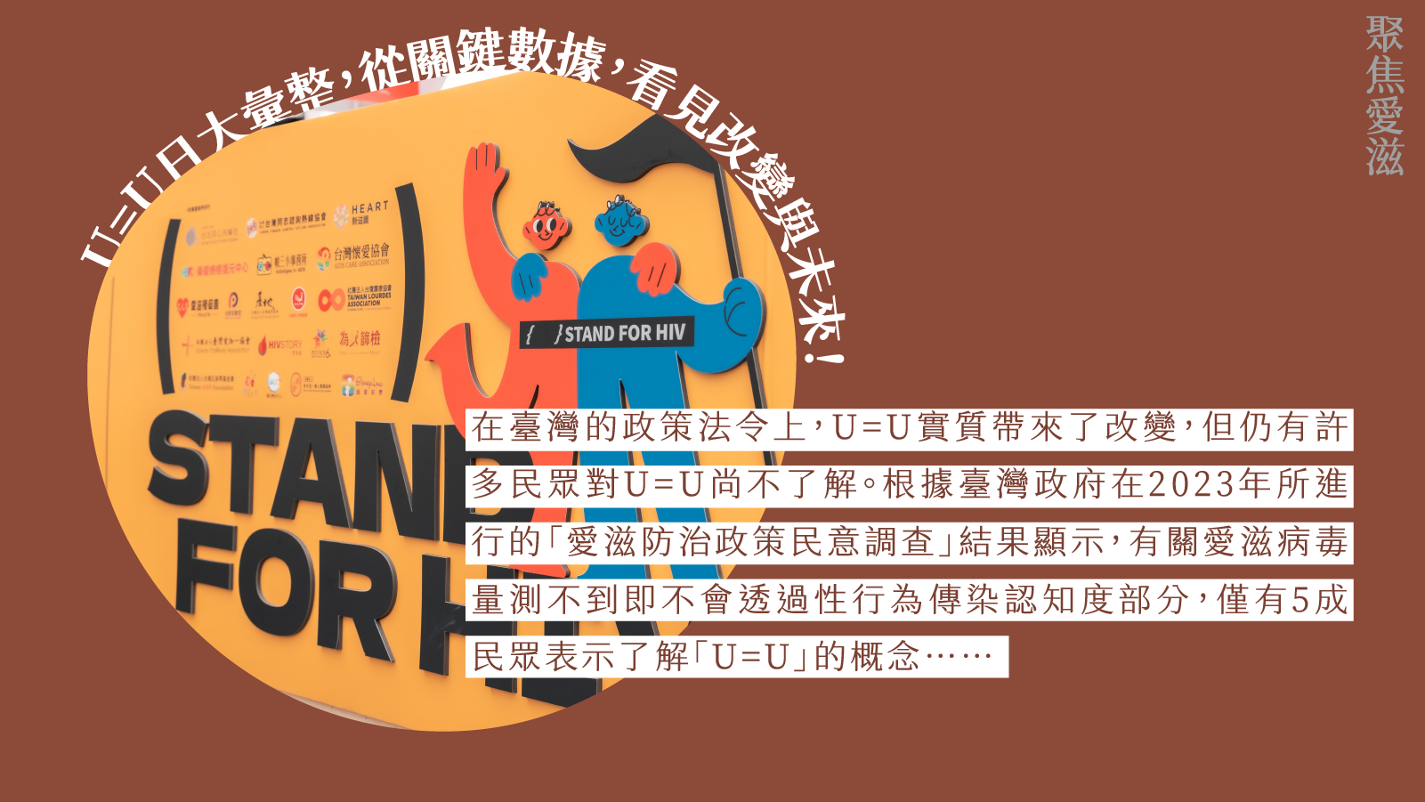 從2023年起07月02日被定為一年一度的U=U日,與我們從「實證研究」、「臺灣U=U感染者比例」、「民眾U=U認知程度」與「醫事人員認知調查」,四個不同面向的關鍵數據,看見U=U在臺灣推廣的現況,並一思索未來我們仍能持續前進的方向……